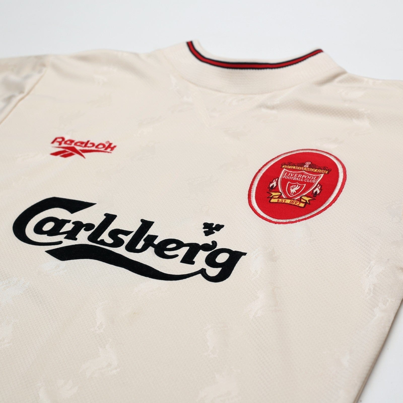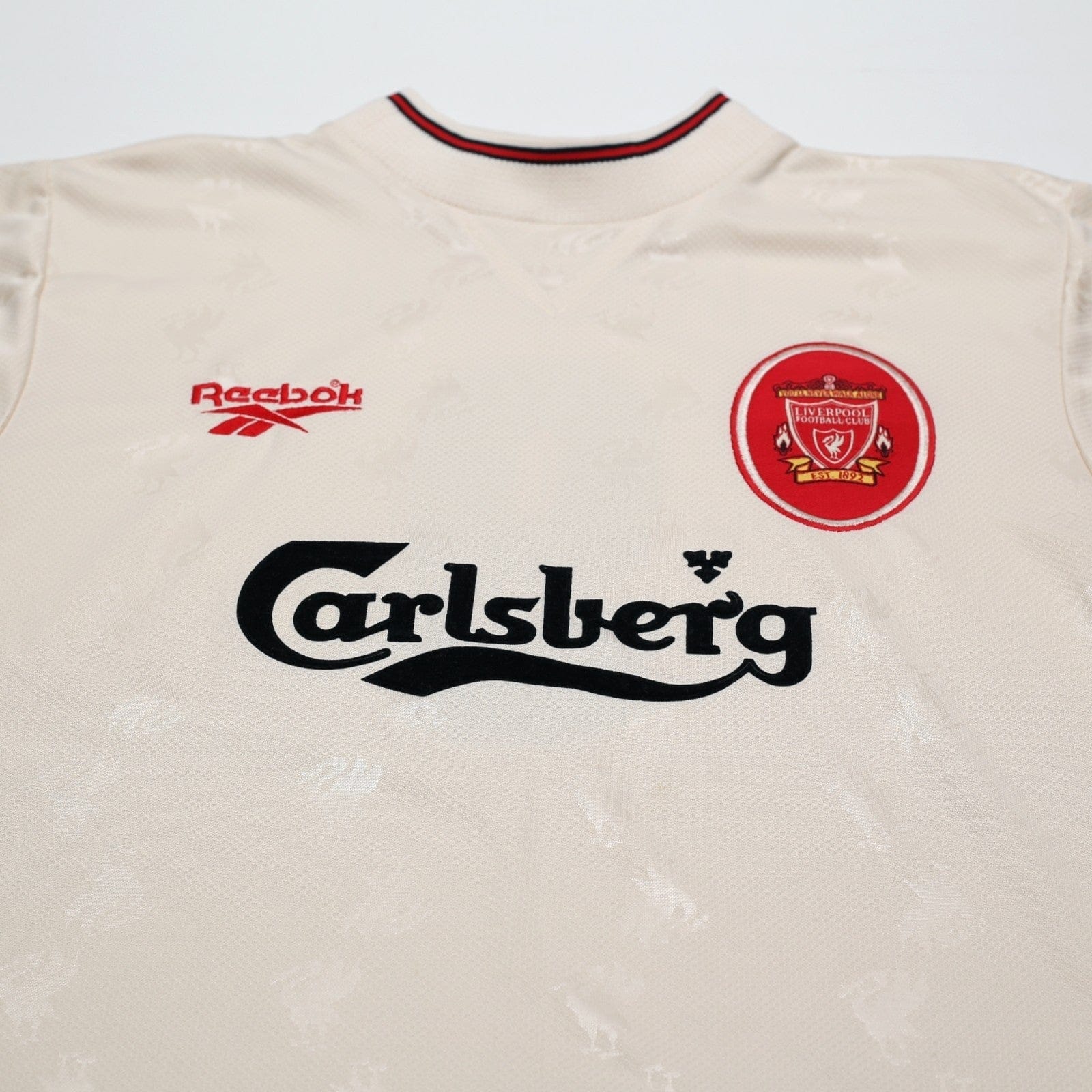 Vintage Reebok away shirt as worn when Liverpool finished 4th in the Premier League. Original style Reebok printing for Kop legend Robbie Fowler #9