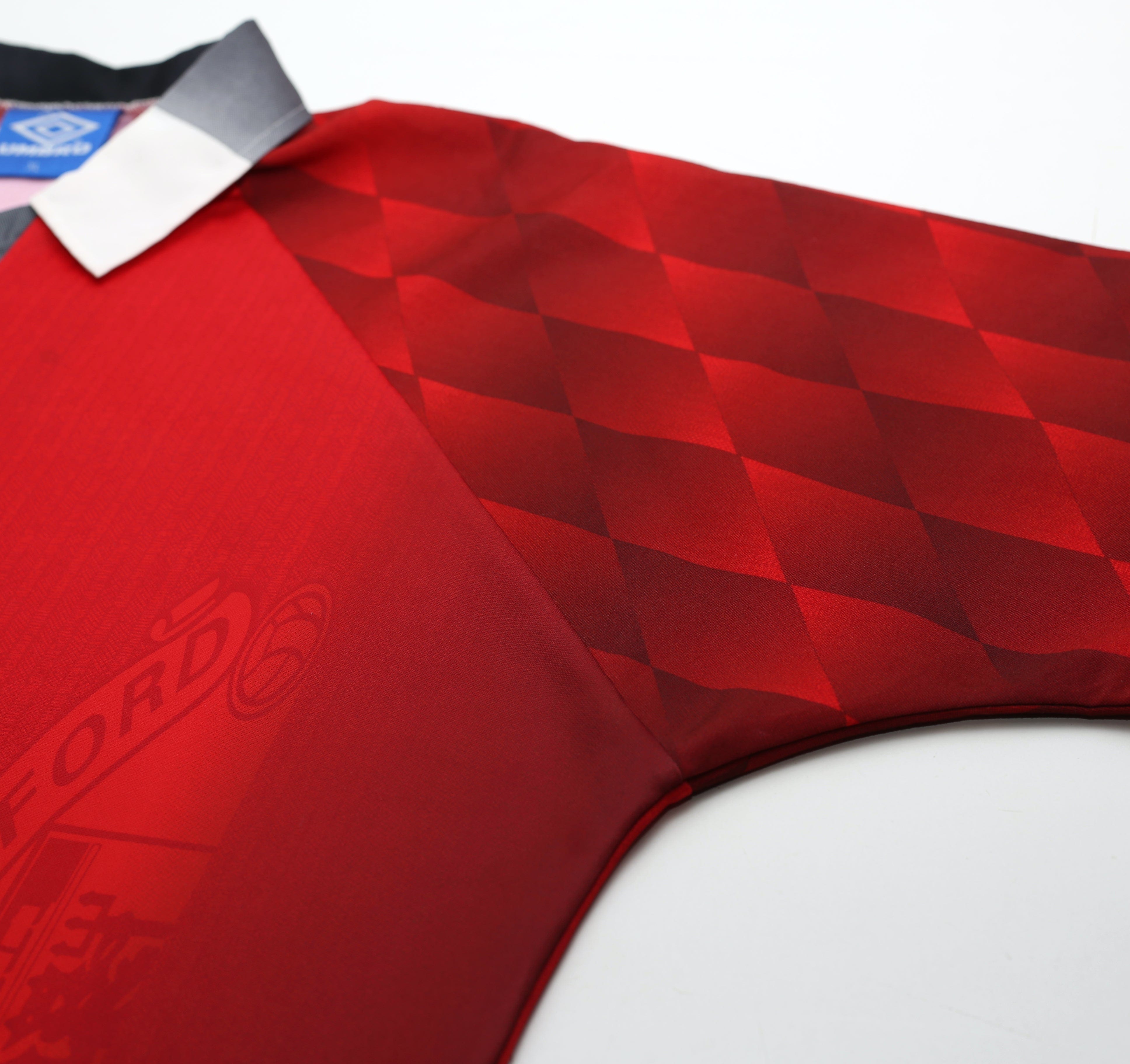 Original vintage Umbro home shirt as worn during Cantona's final season at Old Trafford. Official flock printing for Utd legend Eric Cantona #7.