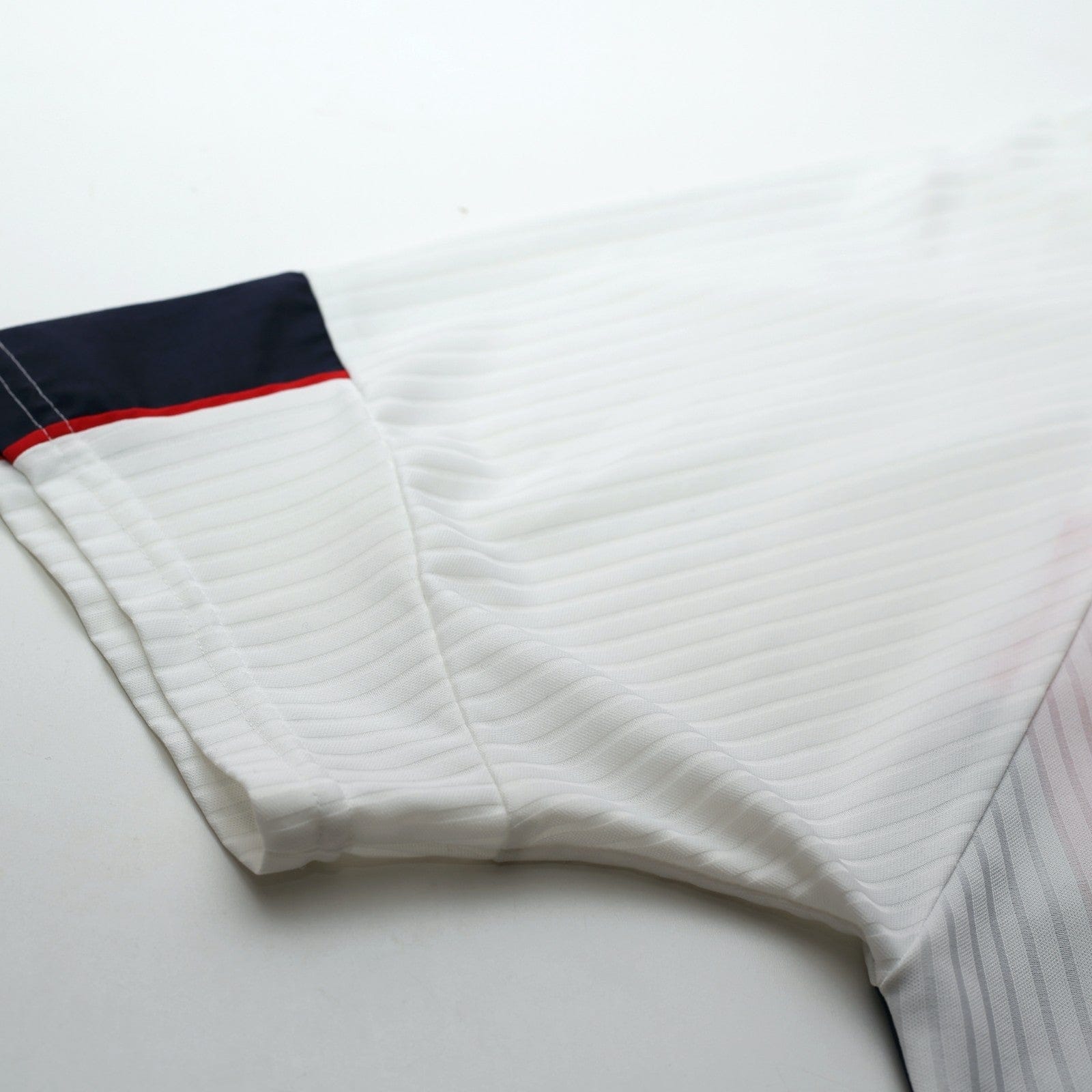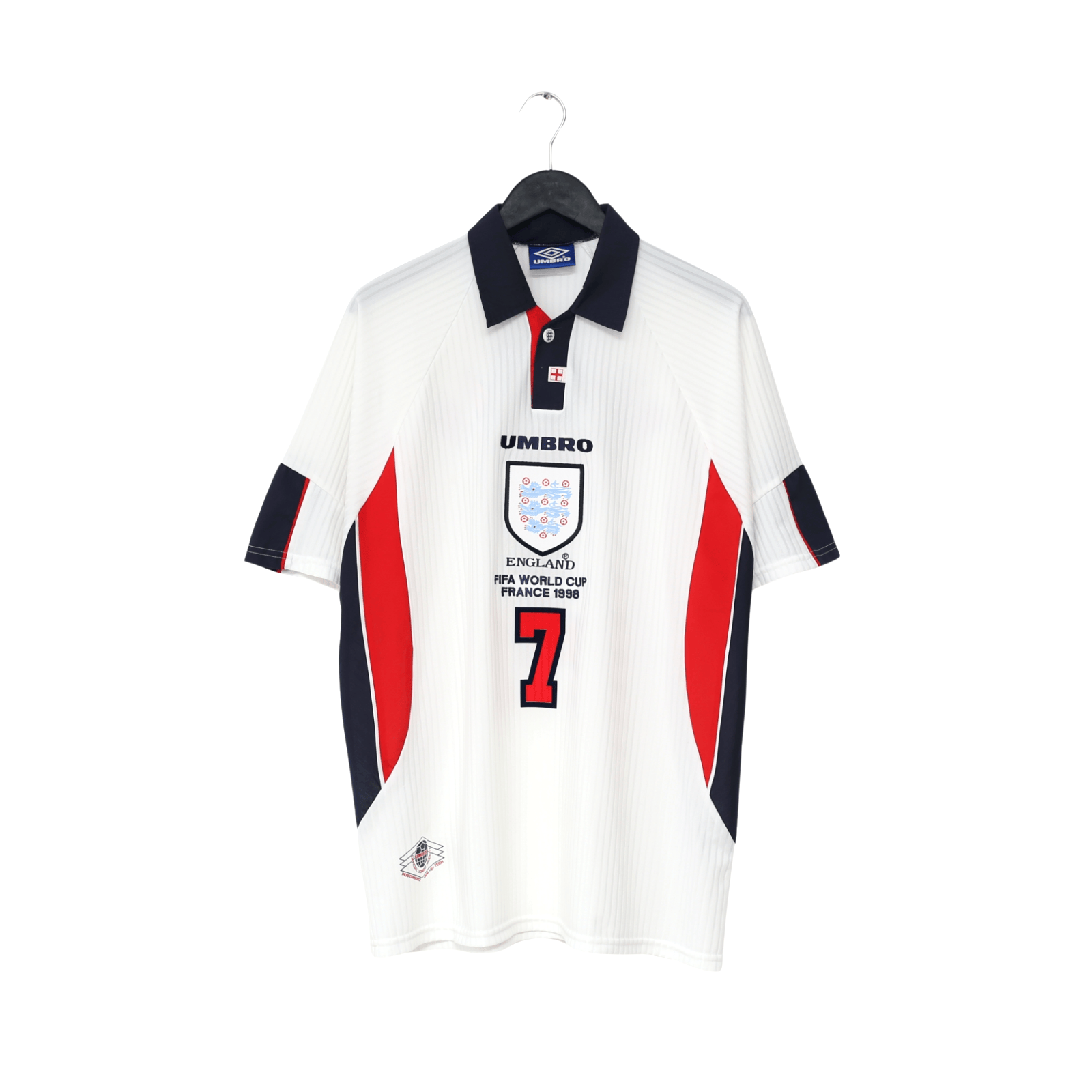 Original vintage Umbro home shirt as worn by David Beckham during the France 98 World Cup in France. Official flock printing.
